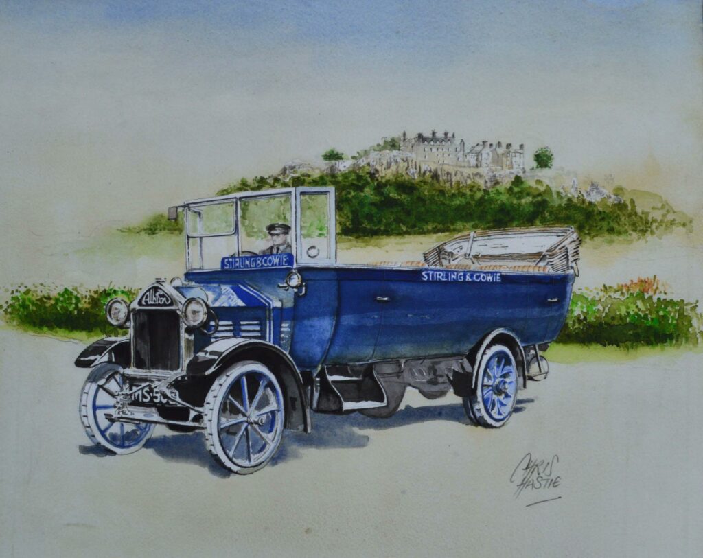 Forsyth commissioned his vehicles from Kinross’s Coach Works, Stirling and from Albion Motors, Glasgow. This splendid Albion vehicle is depicted below the Castle by Stirling – based artist Chris Hastie, who was commissioned to do the work by Forsyth family members. A giclée print of the work is a recent gift to the collections of the Stirling Smith Art Gallery and Museum. The work will also be on show at Falleninch Farm in the Forth Valley Open Studios season, 8 – 18 June, where copies of the print can be purchased.