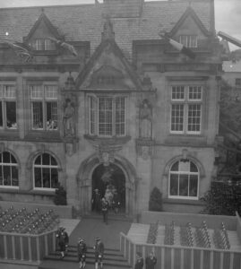 One of the most important businesses in the area was McArees who owned property facing Municipal Buildings, as well as their large store in King Street. In 1937, they built the present red sandstone building opposite Municipal Buildings and for a century had a grand stand view of the historic visits taking place. This photograph is from a collection presented to the Stirling Smith by Mrs Elizabeth Young of McArees.