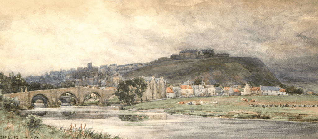Featured today is a watercolour by the eminent Glasgow artist, Alexander Kellock Brown RSA RSW RI (1849 – 1922), purchased recently for the Stirling Smith collections. The artist’s viewpoint is from the Cornton area, looking across the Forth to what was Winshel Place at Laurencecroft (now Drip Road) in the late 19th century. All of the little vernacular buildings, some with red pantiled roofs, were swept away by new local authority housing at Laurencecroft and the rest of Raploch in the 20th century. The magnificent tenement at the south end of the Old Bridge was demolished in 1963. The only building which remains from that time is Campbell’s building at what is now the foot of Lower Bridge Street. There are cattle grazing on Laurencecroft.