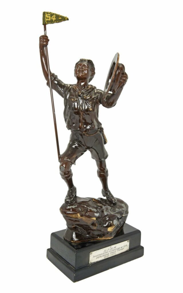 This statuette in cast aluminium alloy, varnished in brown and with gold highlights is one of several items donated to the Stirling Smith by the late Dr. Ken Mackay (1931-2014). Ken was a life-long Scout, and the trophy was presented to him for his services to the 54th Dundee Scout Troop, 1952-1957, as a Scout Leader, before his teaching career took him to Stirling.