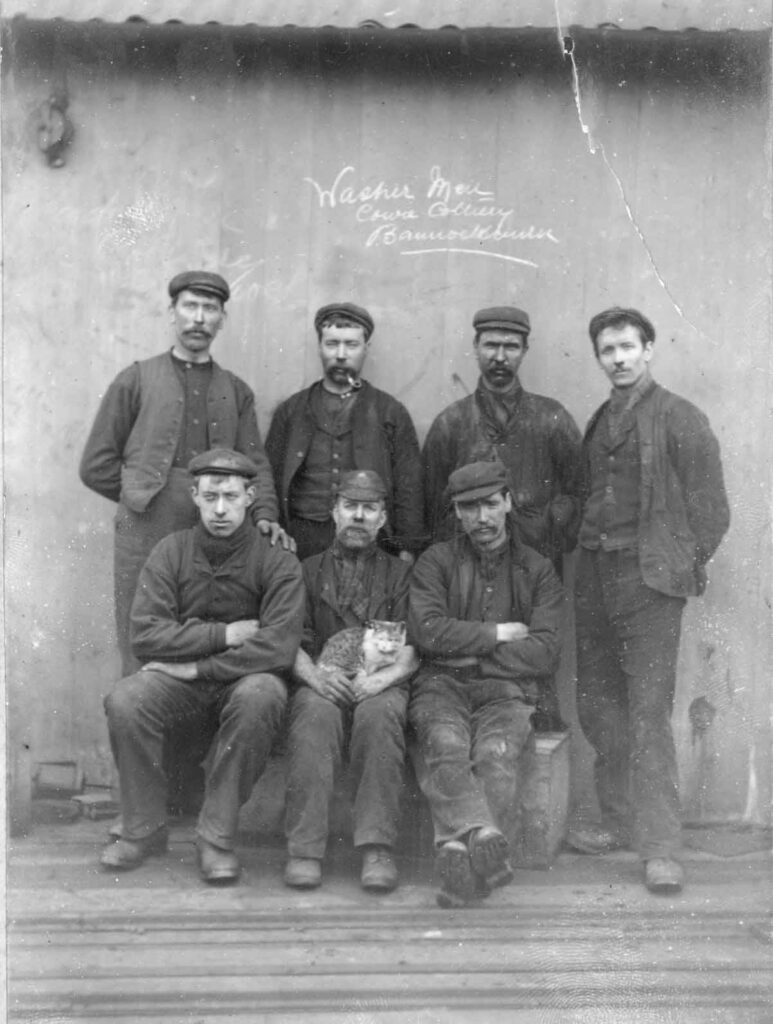 It opened in 1894, ten years earlier than Polmaise, and closed in 1953.The image dates from the 1920s and is of the men who tended the machines which washed the dust from the coal. A man in the back row is smoking a clay pipe and the man in front of him has the pit cat on his knee. Many pits were bothered with rats and mice, attracted by the animal feed spilt in the process of feeding the pit ponies, so cats had a part to play in the mining industry.