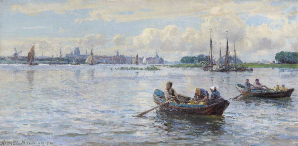 Simply named ‘Habour Scene’ this oil painting by Hamilton Macallum RI RSW, dated 1894 had no indication of its location. Following the suggestion by Martin Hopkinson that this may be Dordrecht, Holland. We began a search that would indeed confirm that this painting was of Dordrecht, from the River Maas.
