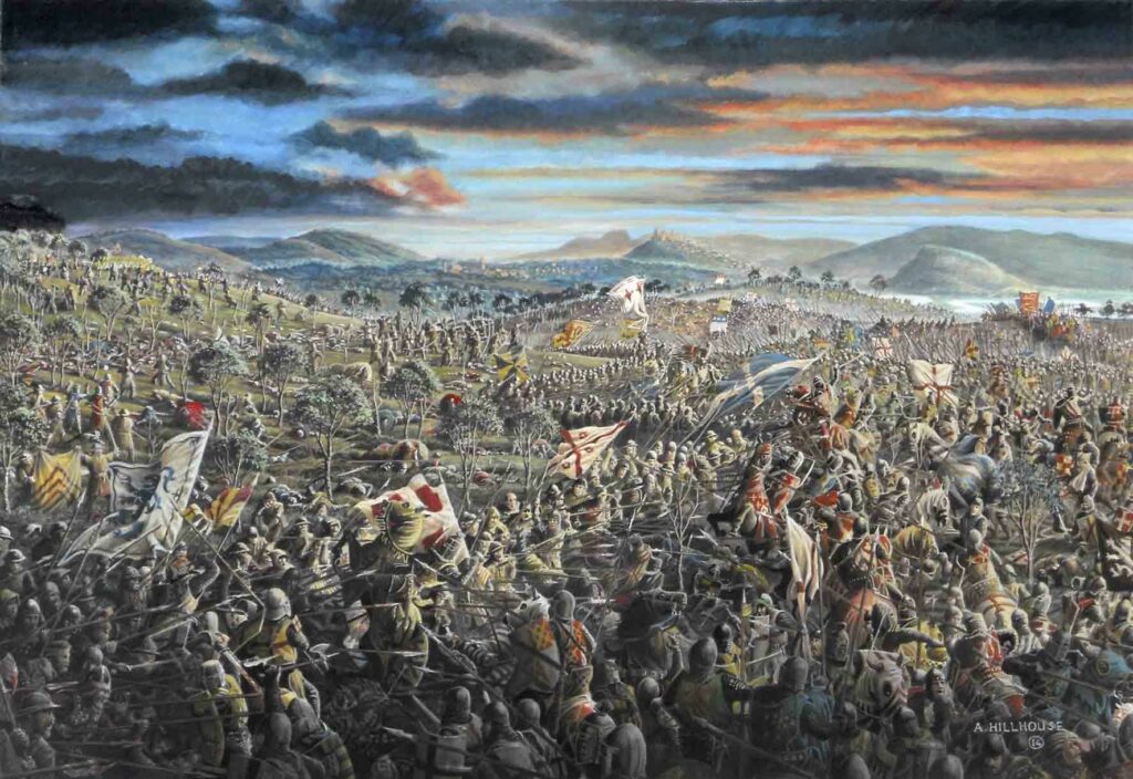 During the summer, this very detailed painting of the Battle of Bannockburn by Andrew Hillhouse is on display in the Stirling Smith Art Gallery’s Bannockburn exhibition. In it, the artist has attempted to include all of the action of the second day of the battle, 24 June 1314.