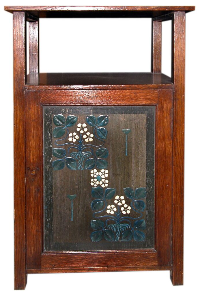 Today’s object from the Stirling Smith collections is an arts and crafts oak cabinet which has a door decorated with gesso. It was made by the furniture maker Henry T. Wyse and was part of the furnishings of No. 1 The Homesteads, Stirling. It was left to the Smith by Ailie Maclaurin (1913 – 2000), daughter of Robert Maclaurin (1871 – 1948) who established The Homesteads in 1911 as a garden city development where the householders could aim for self-sufficiency thanks to the generous amount of land surrounding each house.