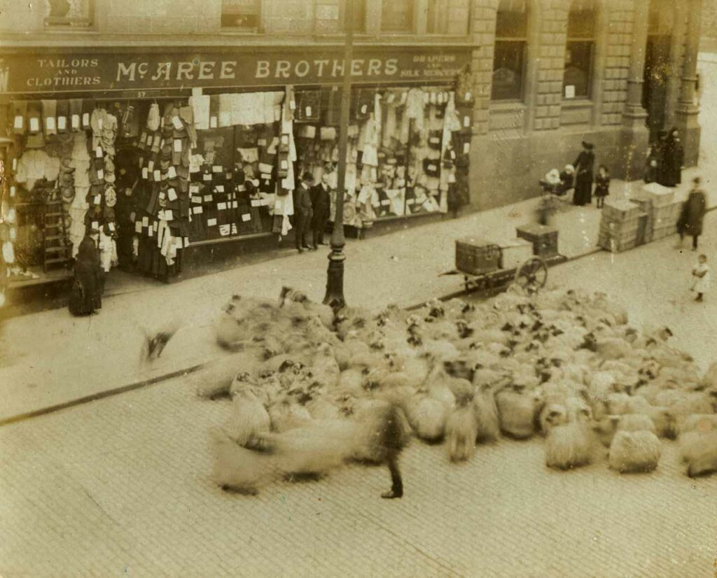 McAree Brothers, established in 1878, are described by current fans familiar with their shop in King Street as “knitting heaven in Stirling” on account of their yarn stock and knowledge of the world of knitting. As can be seen from this photograph of c1900, they have always had a close relationship with wool. The flock of sheep are on their way to the market in Wallace Street, and on market days, sheep were as common a sight in King Street as cars are today. On one occasion, a sheep broke loose and had to ousted from McAree’s front window display.