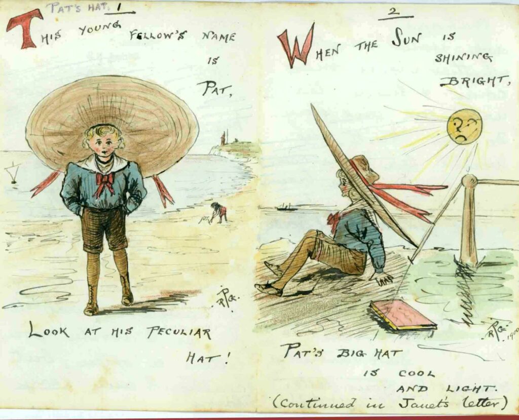 This drawing comes from a handful of letters, written by Dick Partridge of Forthside House, Stirling, for two little girls, Janet and Marion Wilson, who lived in King’s Park. His poem about Pat’s Hat is told and illustrated in alternate letters written in January and February 1900 and intended to amuse the children. The letters were kept by Marion Wilson, and gifted by her daughter to the Stirling Smith.