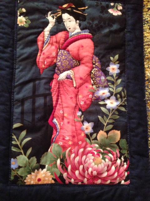 Shown here is a decorative quilted panel, Geisha in the Garden by Lynne Laing. It is one of seven panels with a Japanese theme.