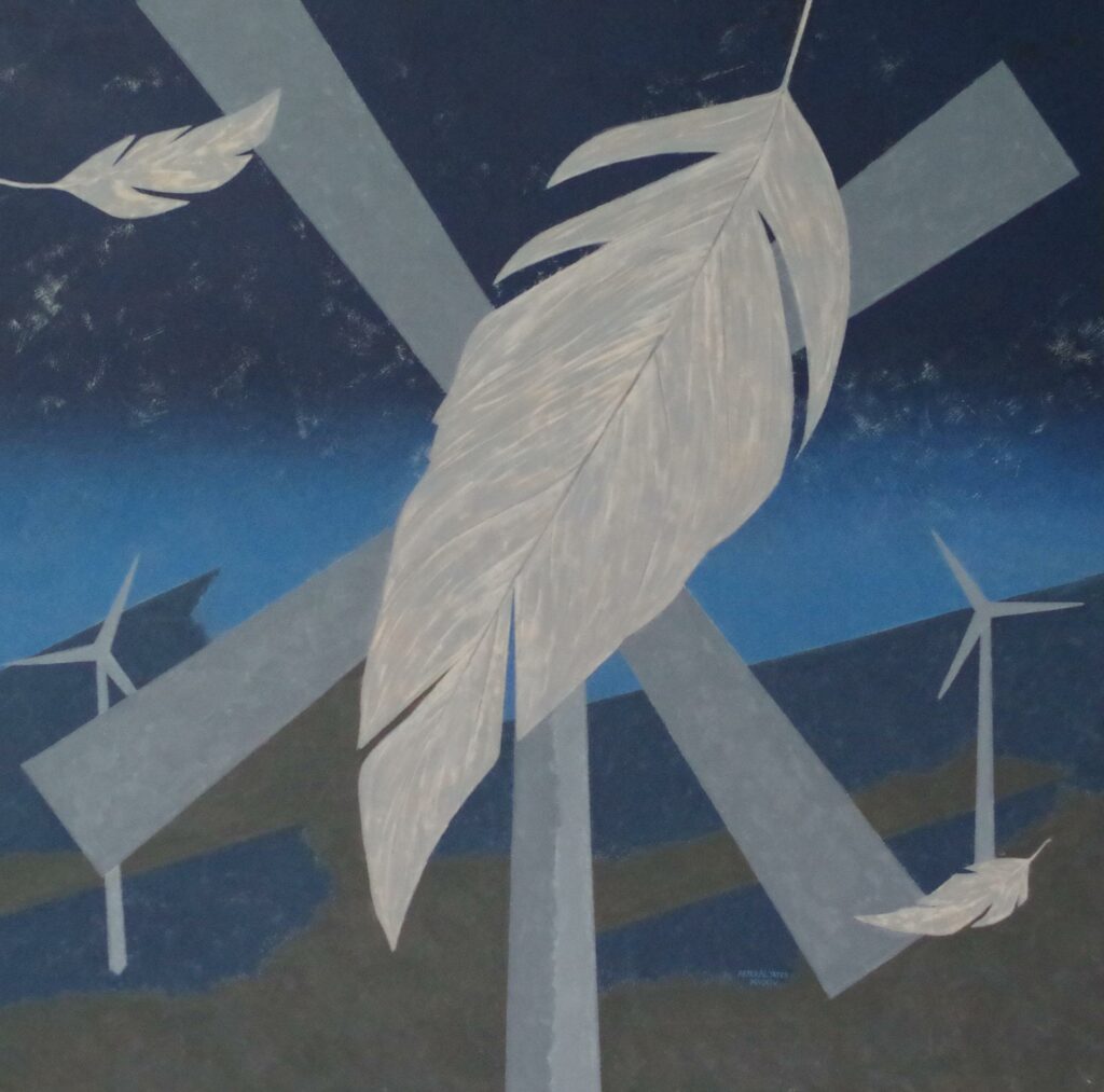 This exhibition, from Stirling – born artist Peter Yates, is part retrospective and part new work. Some of the works have been inspired by wind farms. Although wind farms are Scotland’s fastest growing renewable energy technology and are prominent on the landscape in many parts of Scotland, few artists have found them to be a source of inspiration. Many people consider them to be a blot on the landscape and a disadvantage to tourism.