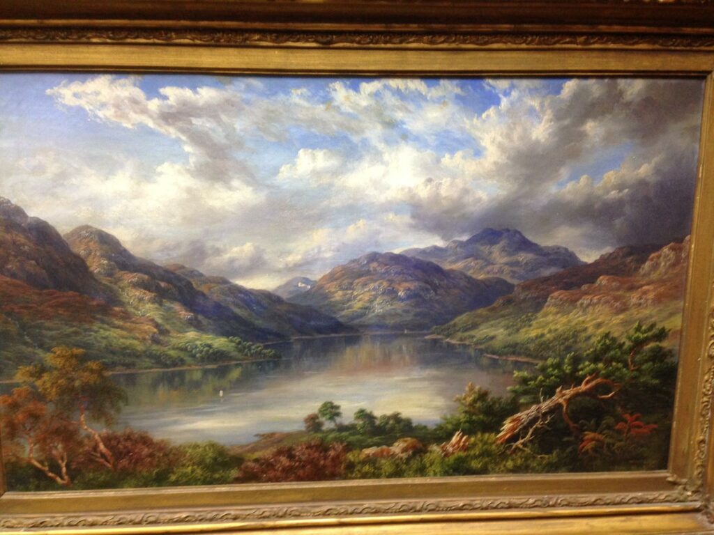 The painting featured here is a recent purchase made possible by the Stirling Common Good Fund and the National Fund for Acquisitions. It is by the eminent artist and Stirling resident McNeil MacLeay (1806 – 1883) and was painted in 1868. The title, in the artist’s hand, is inscribed on the back of the frame: ‘Loch Earn from the East with the hills of Balwhither (sic) in the distance’.