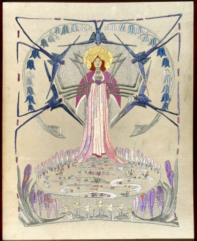 The Treasures of the Smith exhibition, which runs until 4 October has a new acquisition of some significance. It is an embroidered fire screen by the famous suffragette activist and artist, Marion Wallace Dunlop (1864-1942). The subject is Spring and features a woman in long purple robes surrounded by blue birds, bluebells and other spring flowers.