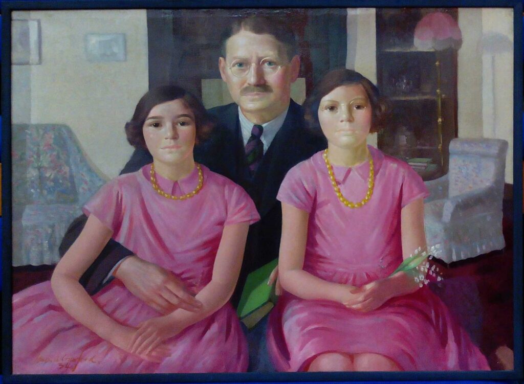 The family is that of William and Winifred Service. William Service was an engineer, and a director of the Parozone Company (now Jeyes). He is painted in the drawing room with his daughters Mary (aged 10, later Mrs Saunders) and Joan (aged 8). When in adult life, marriage brought Jean to Stirlingshire, her sister Mary followed, taking a house in King’s Park, next door to the Smith.