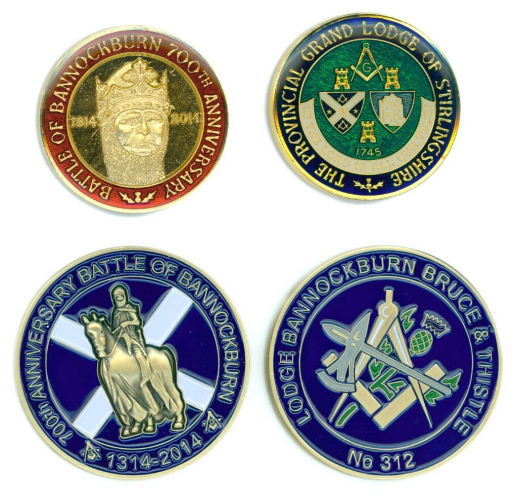 There will be many commemorations for Bannockburn 700 throughout the world, wherever Scots meet. Bannockburn near Geelong in Victoria, Australia also has its own battle re-enactment scheduled for 22 June. Here in Stirling the Masonic societies in the Provincial Grand Lodge of Stirlingshire have had a commemorative dinner for over 200 of their members. Two medals have been struck, both featuring the statue of King Robert the Bruce by the sculptor Pilkington Jackson, unveiled 50 years ago by Her Majesty the Queen. One is issued by the Provincial Grand Lodge, the other by Lodge Bannockburn Bruce and Thistle, and examples of both are in the Bannockburn exhibition at the Smith.