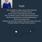 They were asked to link their Truth ideas to objects or stories in the Stirling Smith Museum – watched over by Oswald- our famous Cat in Residence, these include The Oldest Football in the World, a delightful Doll’s House, and a bust of the medieval poet, Blind Harry. Grim reminders of the past are the cloak and axe used by the executioner of John Baird and Andrew Hardie in 1820. Carved in slate at the entrance to ‘The Smith’ are the lines which Robert Burns wrote on a window – later smashed and then restored – in the nearby Golden Lion Hotel.