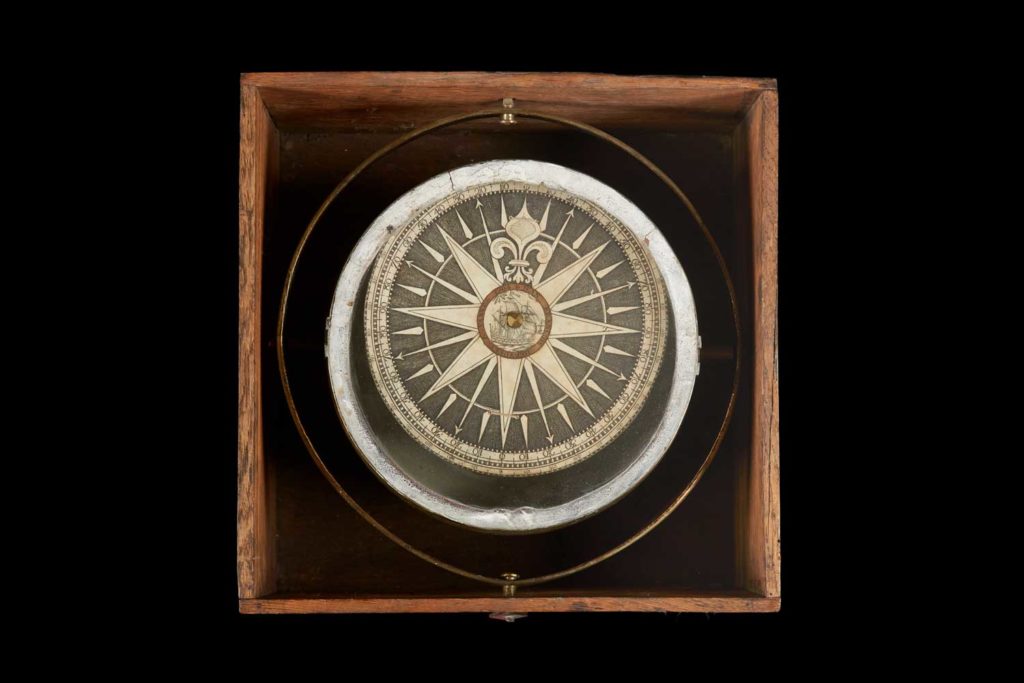 This mariner’s compass was made in France in 1764 by a French maker called Jean Francois Hervouet. If you look at the very centre you will see a beautifully illustrated, three-masted sailing ship. Vessels like this often had a much less attractive purpose in the 18th and early 19th centuries – they were used in the transatlantic slave trade.