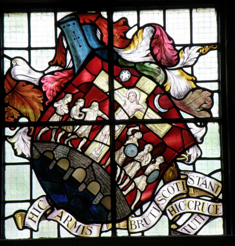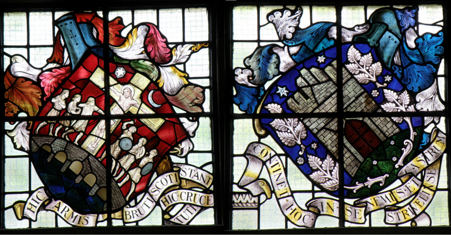 The stained glass window in the Entrance Hall of Alexander II’s presentation of a weekly market to the burgesses in 1226 was designed by Gillespie himself and made by William Meikle and Sons of Glasgow. Shown here are the heraldic Arms of Stirling which flank it. The inscriptions note that ‘The Britons stand by force of arms/ The Scots are by this cross preserved from harm/The castle and bridge of Stirling town /are in the compass of this seal set down’.
