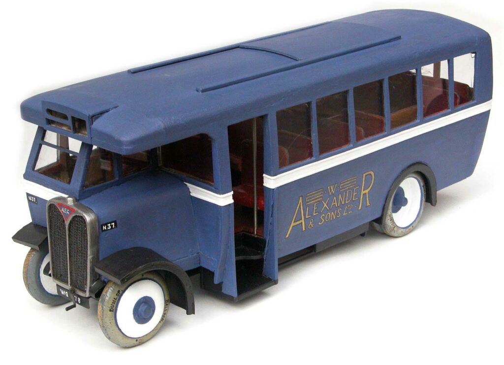This Raploch-built bus of the period 1931-1935 is a service bus, and recent purchase for the Smith’s collections. It required extensive restoration, and both purchase and restoration money came from the Friends of the Smith. Transport history is not something which can be dealt with comfortably in the present confines of the Smith, but fortunately, this bus is a toy measuring 25 by 7 inches. Most of the bus details are faithfully reproduced, and at one time it even had lights inside. It is typical of the kind of pre-war toys which skilled workmen made for their children. The bus has a Falkirk registration number, and the only thing missing is the headlights.