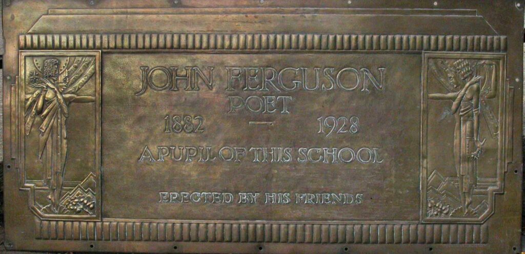 Such pieces are out of place in a modern school, but the art deco beaten brass plaque is the work of the renowned metalworker, silversmith and sculptor, Peter Wyllie Davidson (1870 – 1963). Davidson was born in Bridge of Allan, and for a period of 38 years, until he retired in 1935, was the chief instructor in metalwork at the Glasgow School of Art. He wrote books on decorative metalwork and leatherwork for his students and his work is highly prized.