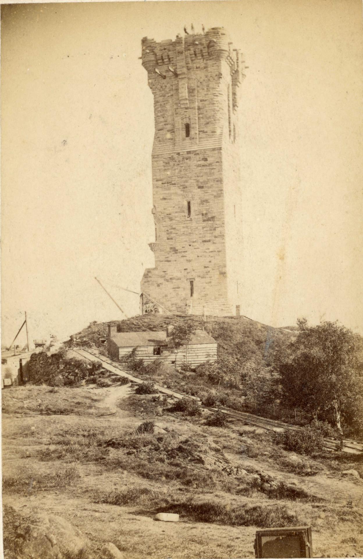The image of the incomplete monument was taken by pioneer Stirling photographer Alexander Crowe of 33 Murray Place. Although small, it clearly shows three workmen near the top of the tower, the builder’s hut beneath and the rail for carting the stone to the top of the Craig.